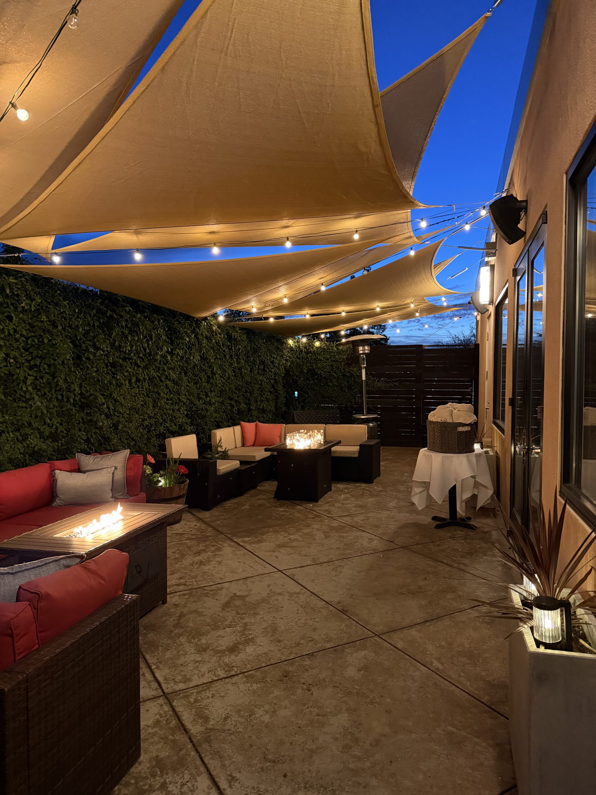 Dine in comfort on our beautiful shaded patio, featuring a cozy fire pit for the perfect ambiance.